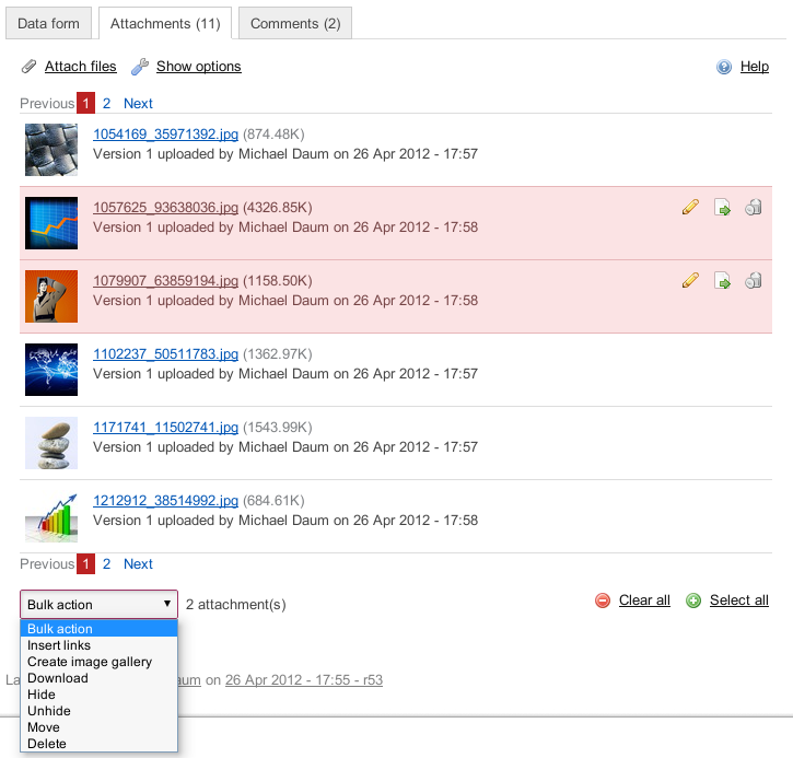 • bulk actions on attachments: delete, move, hide, download as zip archive, create image gallery, insert links